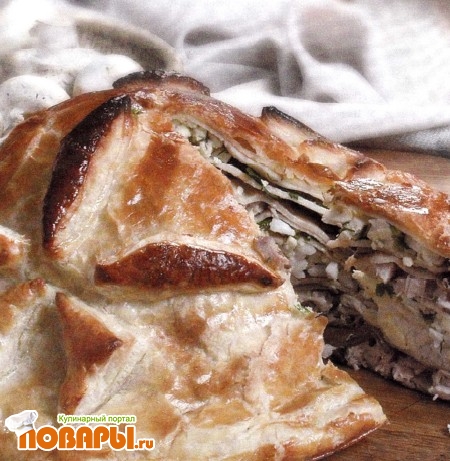 Прослаивая блинчиками, выложить рисовую, грибную и яичную начинки, накрыть большим кругом слоеного теста, защипать края, украсить цветком из кусочков теста.