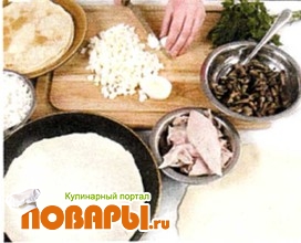 Положить на слоеное тесто 1 блинчик и выложить слой куриного филе, посолить и поперчить.