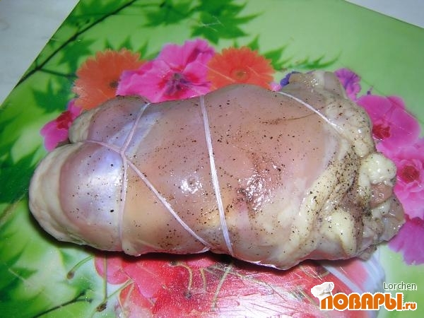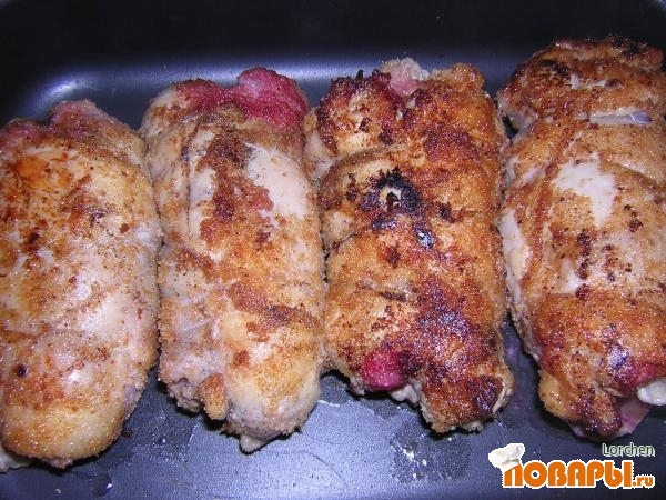 Окорочка освободить от костей, не нарушая целосность мяса, филе отбить, посолить, поперчить по вкусу. Положить на мясо кусочки сыра, колбасу и ягоды вишни без косточек.