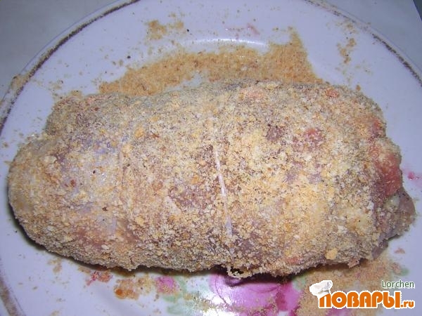 Рулетики обвалять в панировочных сухарях и обжарить в растительном масле с двух сторон до золотистного цвета.