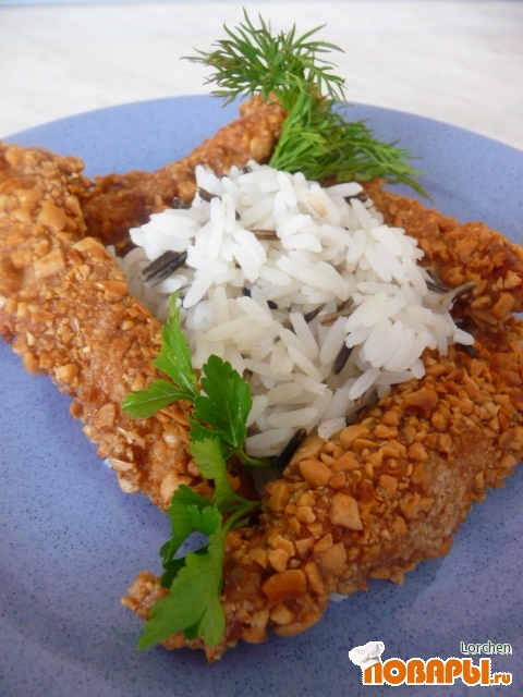 Куриную полоску обваливаем в муке, затем в взбитом яйце, а потом в измельченном арахисе. Жарим на растительном масле с двух сторон.