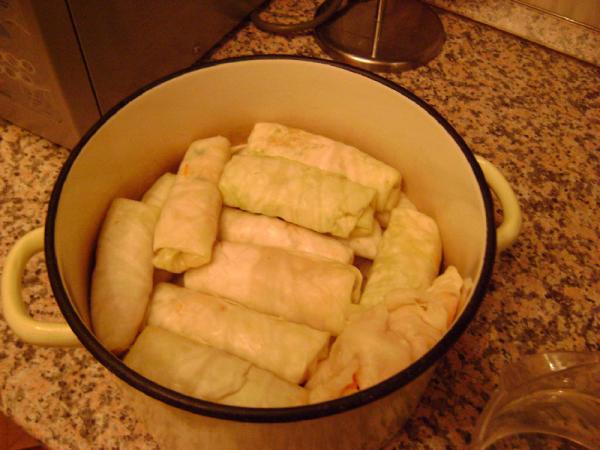 Капусту приготовить как для голубцов (обдать кипятком и разделать на листочки).