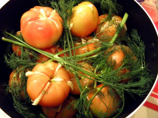 Делаем рассол. На каждый литр воды добавляем 60 г соли. Укладываем помидоры в удобную емкость и заливаем теплым рассолом так, чтобы он покрывал полностью помидоры. Добавляем веточки укропа,