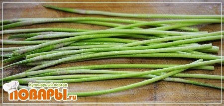 Пока мясо жарится- тушится можно постепенно подготавливать другие продукты. Чесночные дудки помыть и порезать длиной в 5-7 см.