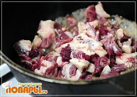 Мясо порезать кубиками 1,5*1,5 см. Выложить на обжаривание(тушить) в казанок, и добавить 0,3 стакана воды. До выпаривания воды. Весь этот процесс займет 25-35 минут.