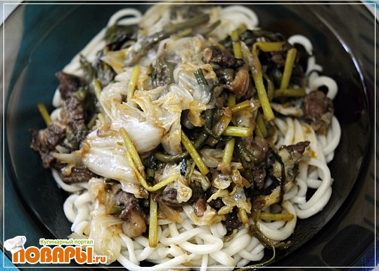 Теперь можно выкладывать к мясу подготовленные продукты: дудки чеснока, джандо, лук, зеленый лук или джусай если есть. Обжариваем минут 20-25