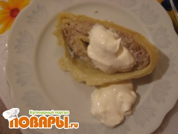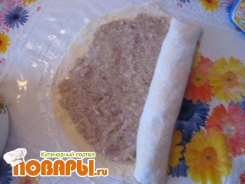 На тесто кладу слой фарша толщиной 1см и заворачиваю все рулетом, защемляю края, чтоб сок не вытек.