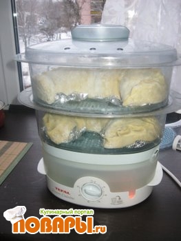 И в пароварку на час - полтора! А чтобы тесто потом не выкалупывать из дырочек дна пароварки, стелю на дно лист фольги.