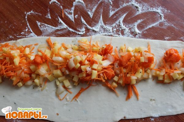 Выкладываем начинку на одну половинку теста (вдоль), СОЛИМ. Накрываем начинку второй половинкой теста, НЕ слепляем. Начинки можно много. Будем сейчас аккуратно сворачивать. Кстати, при сворачивании получается в центре очень много теста, чтобы тесто разбавить, можно то резать тоненькими пластиночками морковь или кабачок или что угодно, положить сверху на тесто, а потом свернуть аккуратно. По всей длине овощи укладывать не нужно. Плохо слепится.