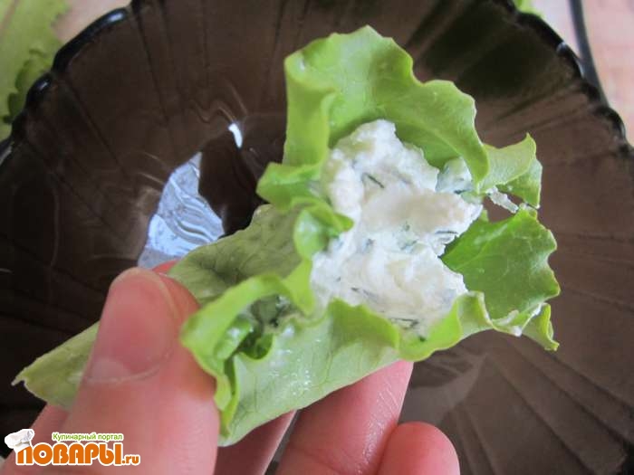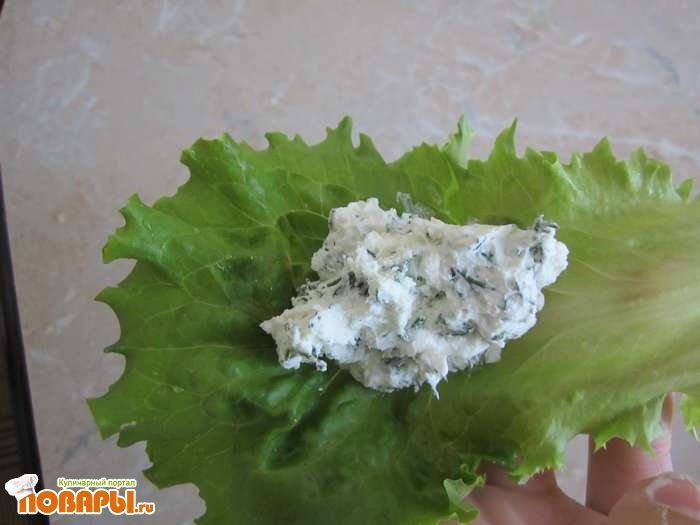 Творожная начинка готова. Дальше берем листок зеленого салата и выкладываем на середину полученную творожную массу.