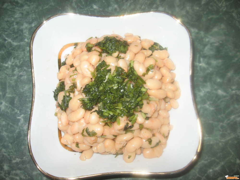 Приправить фасоль перцем и солью, Добавляем орехи с чесноком, зелень и лук, кипятим еще 3-4 минуты, снимаем с огня, охлаждаем. Подаем в холодном виде.