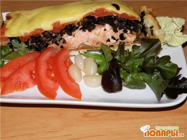 Тесто раскатать, уложить в центр лосось кожей вниз, посолить, поперчить. Оливки, чеснок, стебли базилика пропустить через блендер, полить оливковым маслом. Выложить равномерно на рыбу. Сверху разложить порезанные кружочками помидоры.