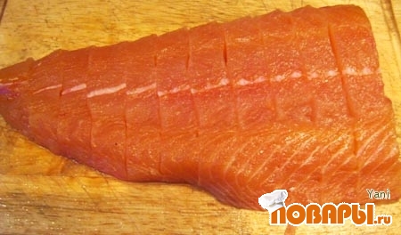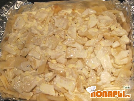 Форму для выпекания застилаем фольгой, смазываем растительным маслом. На фольгу выкладываем кусочки рыбы.