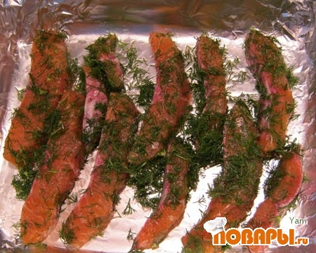 Смешиваем 0,5 ч.л. соли с перцем и мелко порубленным укропом и обваливаем данной смесью кусочки рыбного филе.