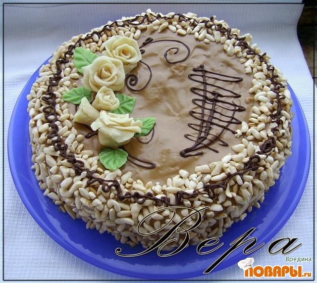 Верх и бока обмазать кремом, бока обсыпать воздушным рисом.