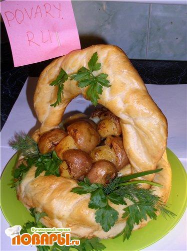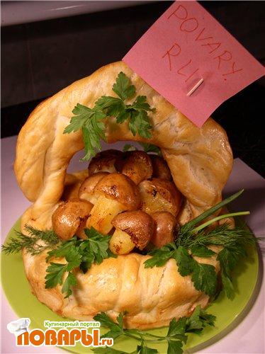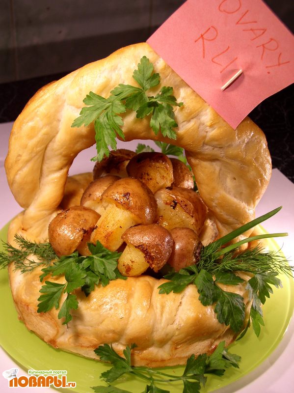 Смотрится очень аппетитно. Оригинально картошка вырезана в форме грибочков, прямо как настоящие!