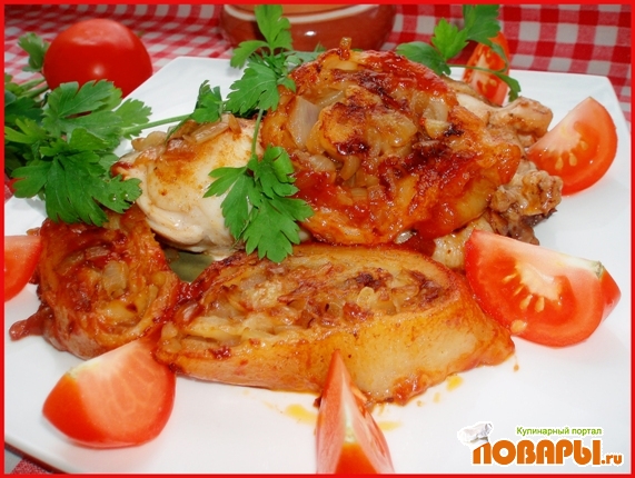 Тесто прикрыть и дать постоять 5-7 минут. Раскатать, выложить жареный лук. Свернуть рулетом, нарезать на кусочки. Жир от жаренья окорочков развести водой, добавить лавровый лист и томатный соус. Выложить в соус рулетики и тушить 10 минут.