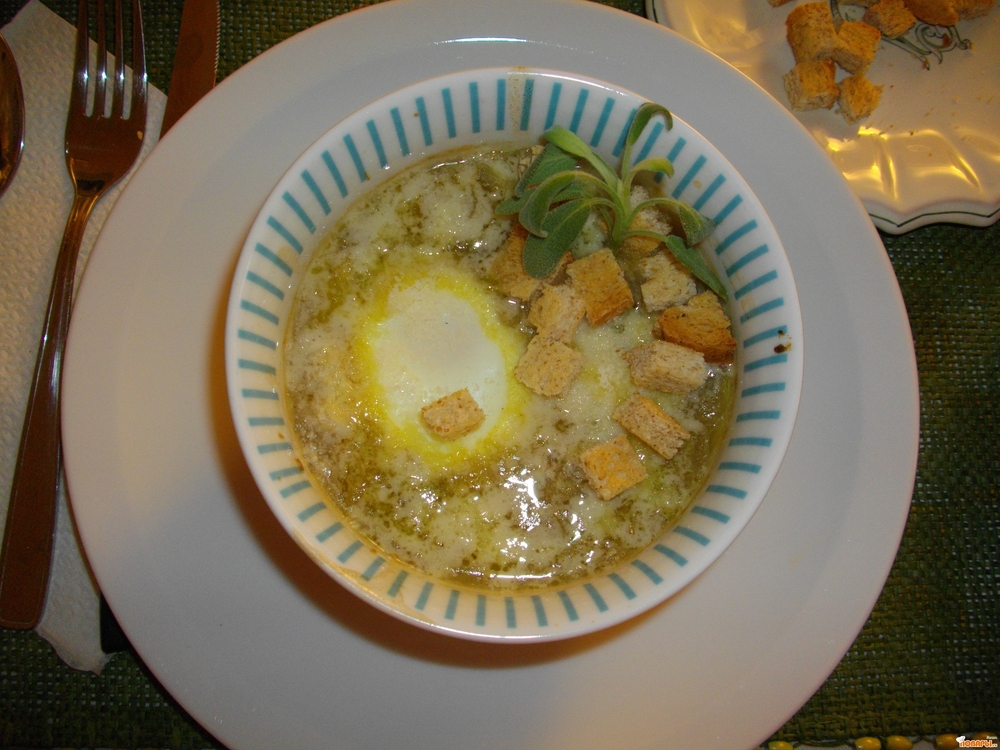 Включаем духовку, чтоб нагрелась до максимума. Натираем сыр на крупной терке. Теперь собираем суп: по числу едоков выставляем на противень жаропрочные пиалки ( по мне, так из них суп есть удобнее, чем из горшочка, а вы готовьте в чем вам удобнее, главное, чтобы подавался суп порционно) на дно кладем по веточке тимьяна (наш русский чабрец, чебурок, некоторые гурманы натирают горшочек чесноком), раскладываем лук, вливаем закипевший бульон (немного, суп должен быть густым), сыплем по щепотке мускатного ореха, сверху осторожно выкладываем по одному сырому яйцу,Кликните для увеличения засыпаем верх тертым сыром и в хорошо разогретую духовку на 10-15 минут.