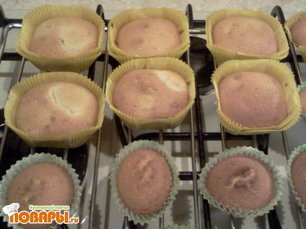 Для выпечки я использовала бумажные формы, по правилам они вставляются в металлические или силиконовые формы для маффинов, но у меня таковых не оказалось, поэтому пришлось для каждого маффина использовать по 3 формочки. Если делаете в бумажных формах, то следите, чтобы тесто не заполняло полностью, иначе все вытечет до того, как запечется. У меня кексы немного потекли, но это их вкуса не испортило.