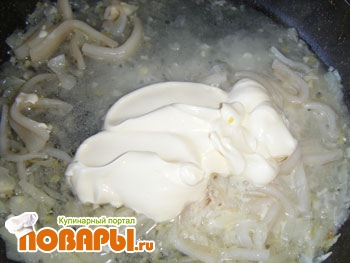 Тщательно перемешиваем. Затем кладем туда же кальмара и макароны, все смешиваем и готовим 5 минут.
