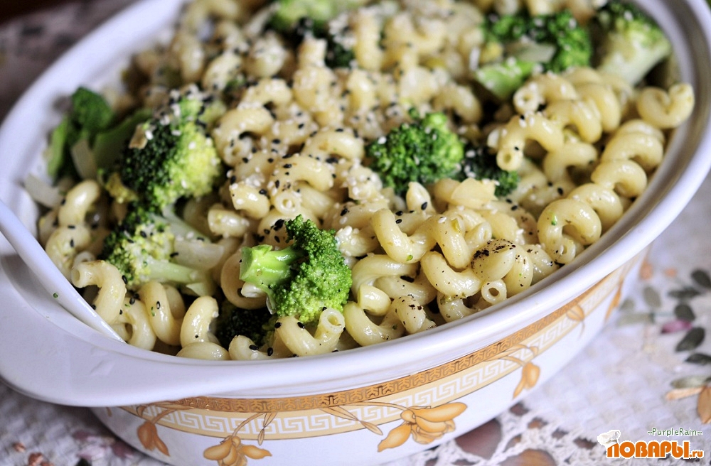 Когда все ингредиенты будут готовы, нужно все собрать вместе. Макароны, брокколи – перемешать. Базиликом с маслом, залить жаренным луком - перемешать. Засыпать горошек.