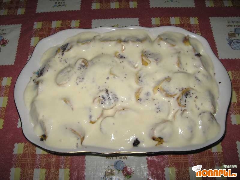 Выложить мак на блинчики и свернуть в трубочку. Каждую трубочку разрезать на 3-4 пенечка. Получившиеся пенечки сложить в глубокую тарелку и залить подливкой. Доля подливки взбить сметану с сахаром.