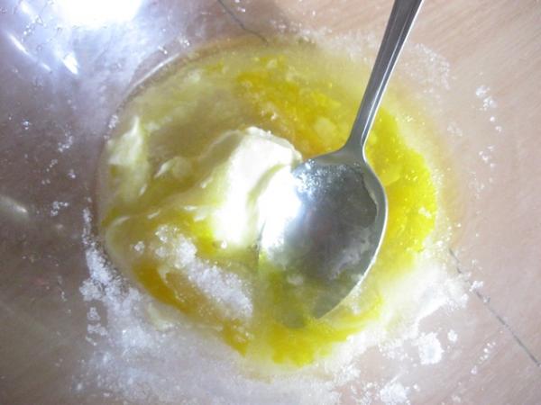 Растопить маргарин, добавить яйцо, сахар, соль, растительное масло и ванильный сахар, размешать.