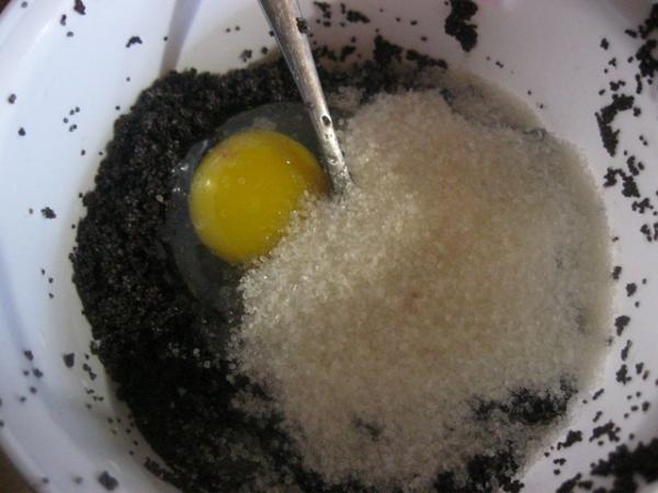 В кастрюле вскипятить воду, всыпать мак и размешать. Когда вода с маком закипит, процедить через сито и перекрутить на мясорубке. Добавить яйцо, сахар и перемешать.
