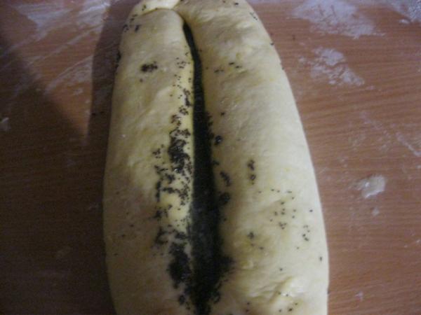 Свернуть не тугой рулет, закручивая с двух сторон. Перенести на противень и дать постоять еще 15 – 20 мин.