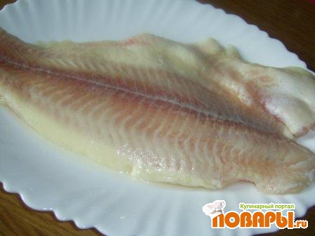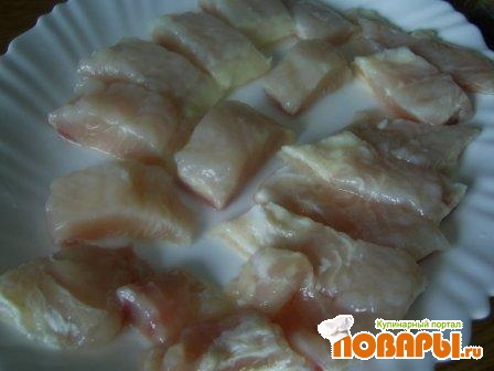 Перекладываем эту смесь в тарелочку, лишнюю жидкость сливаем. Рыбу режем на небольшие прямоугольные кусочки. У меня получилось 16 кусочков (примерно 2-3 см на 5-7 см).