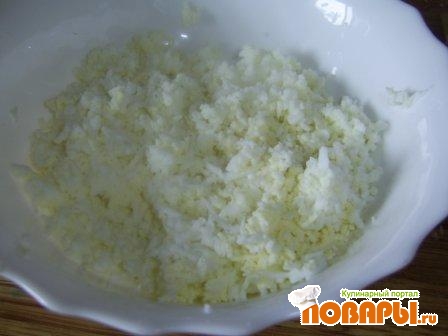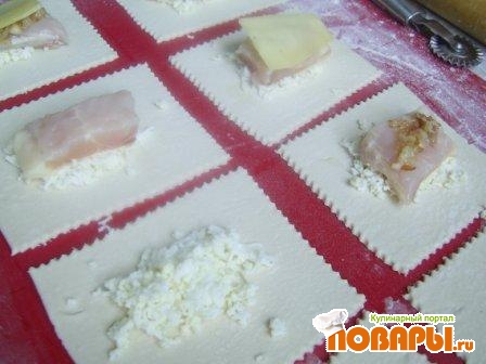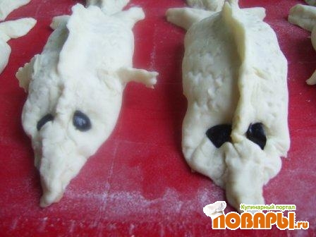 Раскатываем 1-й пласт теста прямоугольником примерно 20 на 40 см., из него вырезаем 8 прямоугольников. На каждый прямоугольник укладываем слоями: 1 ч.л. тертого яйца, кусок рыбы, немного жаренного лука, пластинку сыра.