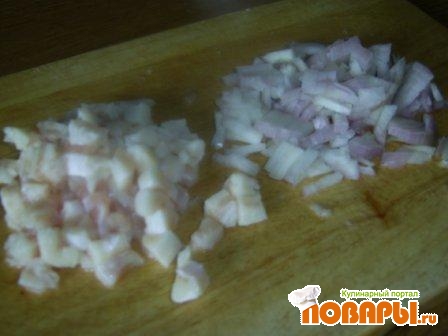 Срезаем жир и часть жирной брюшки, мелко режем. Лук тоже мелко режем и вместе с жиром от рыбы жарим на сковороде, пока жир не вытопится и лук станет мягким и прозрачным.