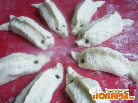 Сырое взбить, обмазать рыбок. Выложить рыбок на противень и в духовку на 20-30 мин., пока они не станут золотисто-коричневые.