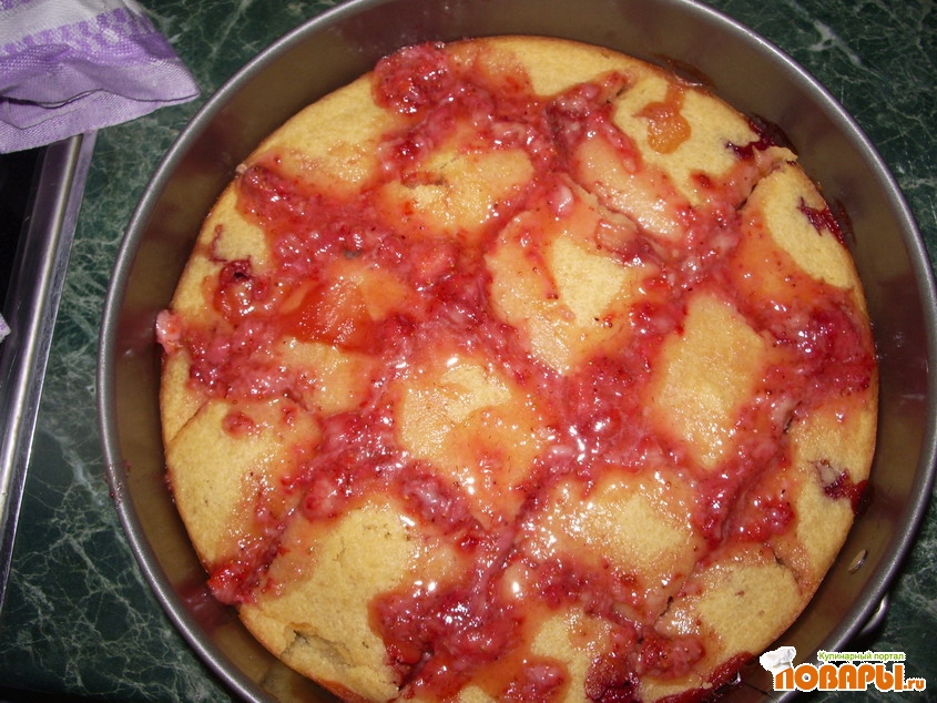 Готовый пирог достать из духовки, сразу же сделать надрезы (такие, какими будут будущие кусочки). Залить эти места толченой клубникой с сахаром. Вернуть в уже выключенную духовку на 15 минут .