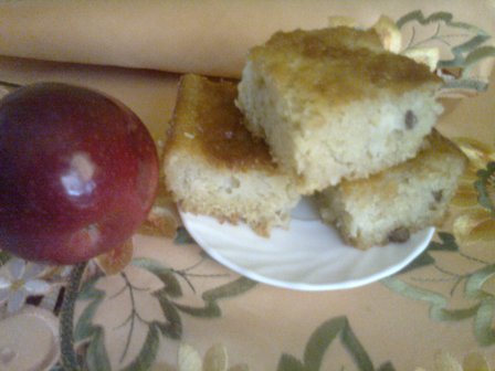 Манку залить кефиром, оставить для набухания на 1 час, можно и дольше. Запарить изюм. Взбить яйца с сахаром, подмешать к манке, добавить соду, гашенную уксусом, муку, хорошенько вымешать. Добавить нарезанные кусочками яблоки и изюм.