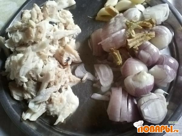 Рыбу отварить и очистить от костей, разделать на небольшие кусочки. Лук порезать полукольцами, чеснок пополам, имбирь - мелкой соломкой.