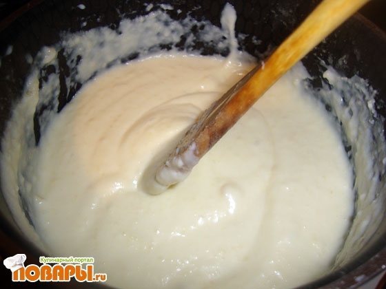 Затем влить тонкой струйкой,при постоянном помешивании 1 стакан горячего молока (разогреть в микроволновке заранее)