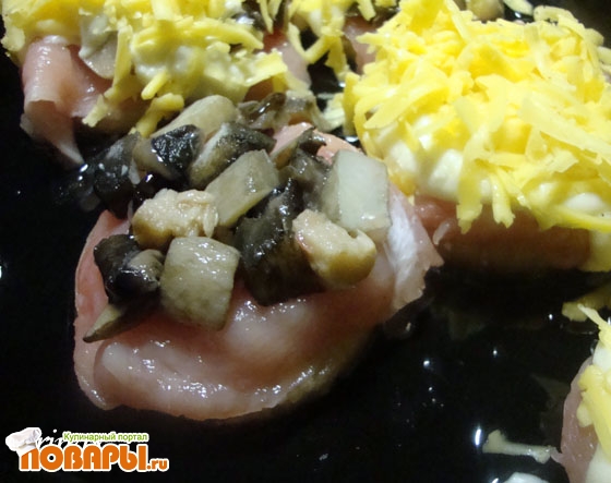 Сверху на ананас положить кусочек подсоленного куриного филе: