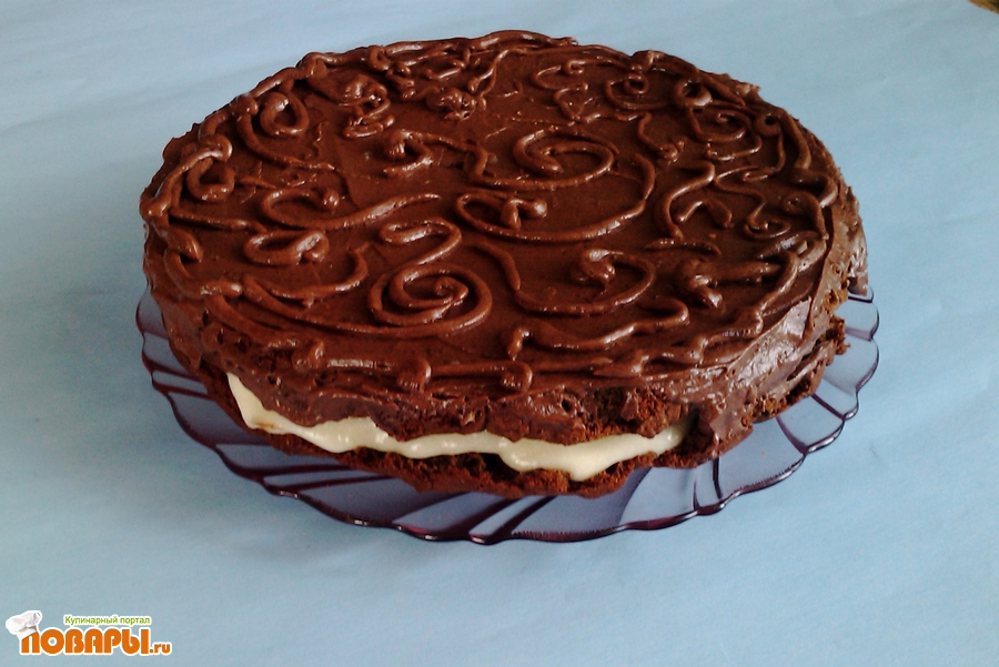Пока шоколадный корж остывает, приготовить заварной крем из стакана молока, полстакана сахара, 1-2 яиц, 1 ст.л. крахмала (муки) и ванилина.