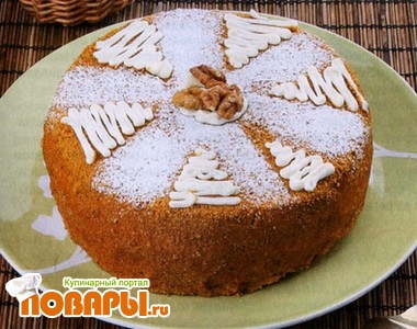 Корж разрезать на 4 части. Сложить их, прослоив кремом (для крема взбить густую сметану с сахаром). Оформление зависит от вашей фантазии или от праздника, к которому приготовлен торт.