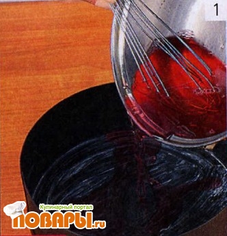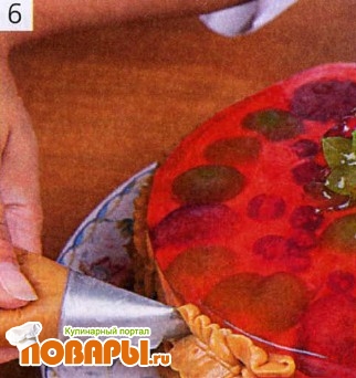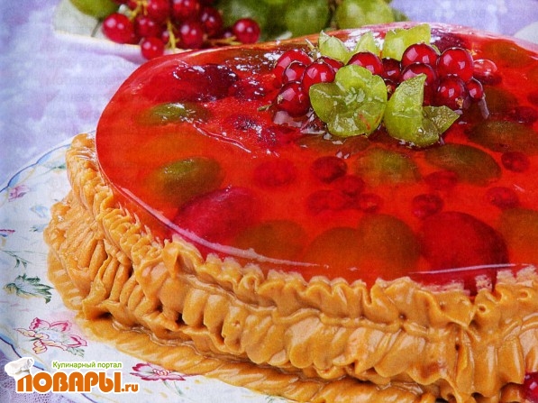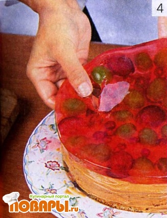 Как только желе застынет как следует, нужно перевернуть форму с желе над поверхностью торта как можно ниже (лучше, если это будут делать два человека) и быстро провести по дну формы тряпочкой, смоченной в горячей воде и сразу отжатой. Масло, которым была смазана форма, от тепла растает, а желе - нет и из формы на торт выпадет блестящий слой желе с красивым узором из ломтиков фруктов.