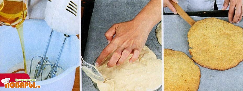 Хорошо взбить 2 яйца, 0,5 стакана сахара, 0,5 стакана меда, добавить 1 ч. ложку соды и 1,5 стакана муки. Все перемешать, закрыть крышкой и подержать сутки при комнатной температуре (ни в коем случае не трясти). Затем на холодный, смазанный маслом противень выкладывать ложкой очень осторожно и намазывать слоем в 0,5 см круги или квадраты. Коржей получится 3~4 штуки.