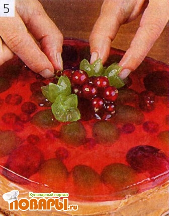 Приготовить фруктовое желе из желатина или сиропа, сока, если торт предназначен для взрослых - вина. Рецепт приготовления есть на упаковке желатина (можно купить готовые пакетики фруктового желе). Желе приготовили, теперь начинаем украшать.