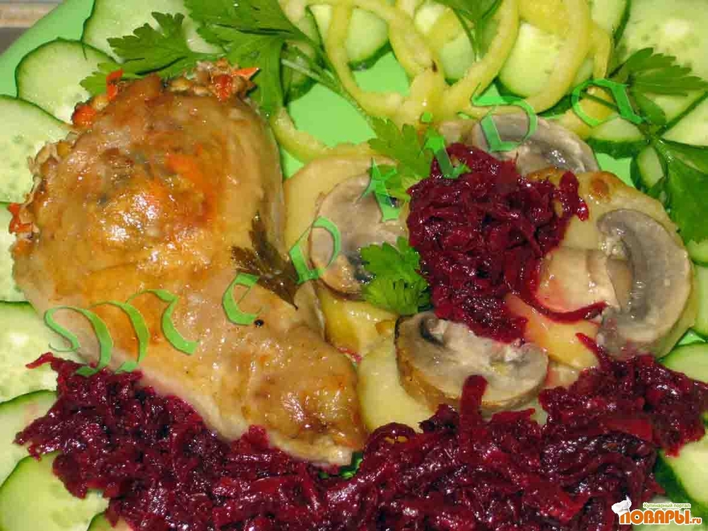 выкладываем курочку, картошечку и грибочки на тарелочку, украшаем свежими овощами, зеленью и маринованной свеколкой (можно и без нее