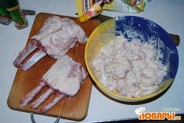 Далее берем ребрышки и соединяем их ниткой во внутрь ложем кусочки мяса чтобы ребрышки раскрылись как можно больше и были похожи на корону, по бокам выкладываем оставшееся мясо. Косточки заворачиваем в фольгу чтобы не подгорели.