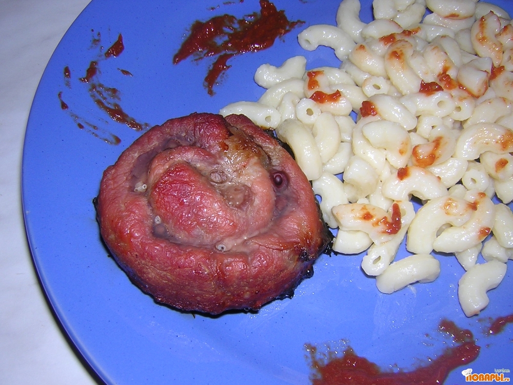 Кусочки мяса выложить в длинную полоску, чтобы края немного заходили друг на друга , места соединения отбить. Посолить, поперчить и смазать кетчупом.