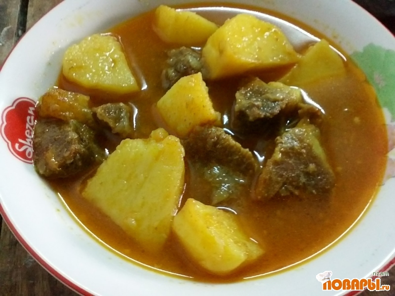 В обжаренный картофель выложить мясо и продолжать тушить, пока не выпарится вся жидкость. Должно получиться мясо с очень густым соусом на дне. Продолжать тушить, постоянно помешивая мясо, 5-6 минут, затем добавить воды до нужной густоты соуса, довести до кипения и потушить еще минут 5. Подавать к рису.
