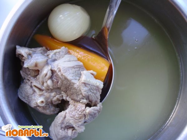Ставим вариться кусок мяса. Варим часа 1,5. Первый бульон сливаем (доводим до кипения, варим немного и все кроме мяса отправляем в далекую экспедицию по трубам). Наливаем чисту водицу, солим, кладем лук, морковь и мясо, довариваем.