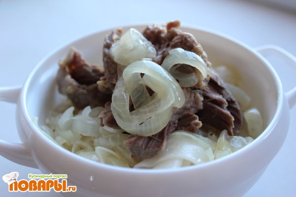 Собираем мясо. Вообще обычно берется большое блюдо, на него раскладывается жайма, вокруг жаймы картофель (его иногда варят в мясном бульоне), затем в самый центр жаймы выкладывается сверху мясо кусками, вокруг мяса выкладывается лук. Бульон подается отдельно. Можно в порционную глубокую тарелку просто все сложить аккуратно слоями и залить сверху бульоном.