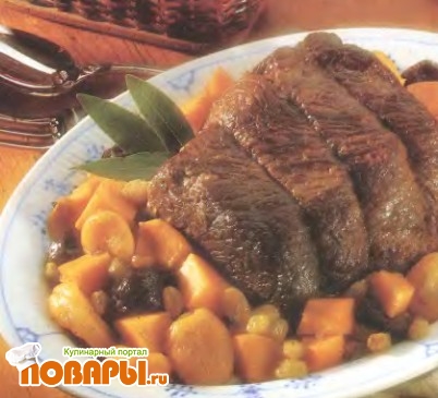 Удалить с мяса нитку, вынуть лавровый лист и снять с соуса излишки жира. Порезать мясо и подать на стол с гарниром из картофеля и фруктов.
